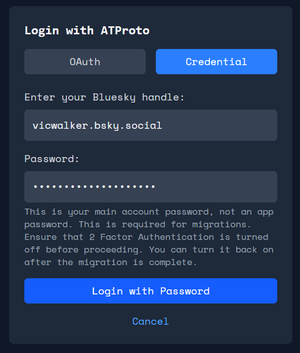 Precisa ser a mesma senha que você utiliza para logar hoje no Bluesky para ter as autorizações necessárias da migração.
