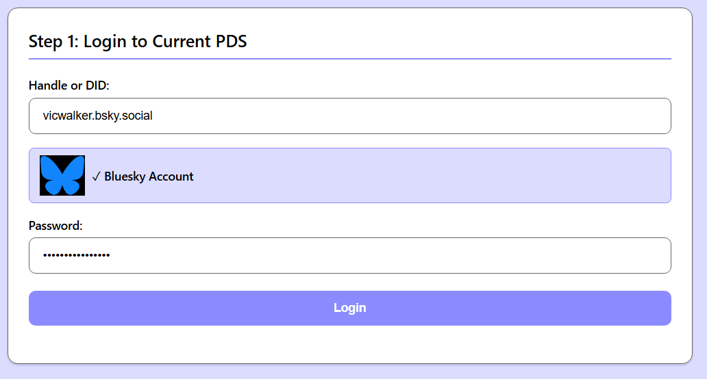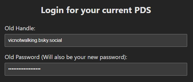 Na primeira parte "Login for your current PDS", preencha o seu nome de usuário atual no campo "Old Handle" e sua senha no campo "Old Password".