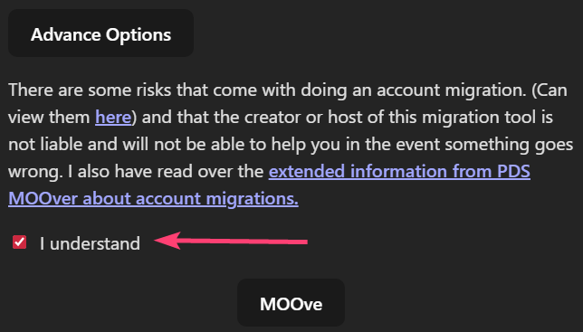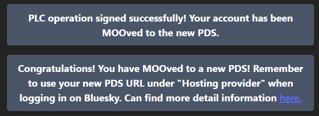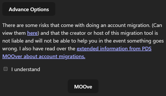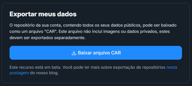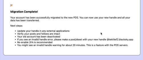 AVISO! Suas senhas de aplicativo (app passwords) NÃO serão migradas, elas sempre serão limpas quando sua conta migra para um novo PDS. Seus salvos (bookmarks), palavras e contas silenciadas, contas bloqueadas e listas de moderação em uso, devem migrar sem problemas.