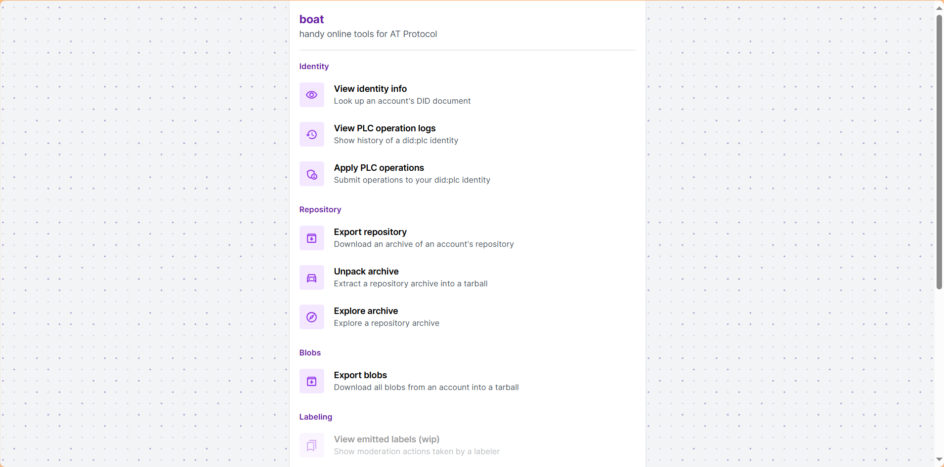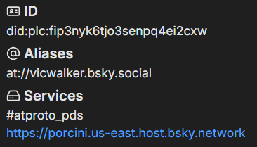 A coleção de dados de uma única conta dentro do PDS é chamada de repositório, e contém por exemplo: seus posts, likes, dados de perfil, quem você está seguindo, etc. Separado do seu repositório, mas ainda dentro do mesmo PDS, existem os blobs, que são arquivos binários de todas as mídias da sua conta, como imagens e vídeos. E tudo isso é conectado ao seu identificador descentralizado (DID, que é permanente e único para cada conta).