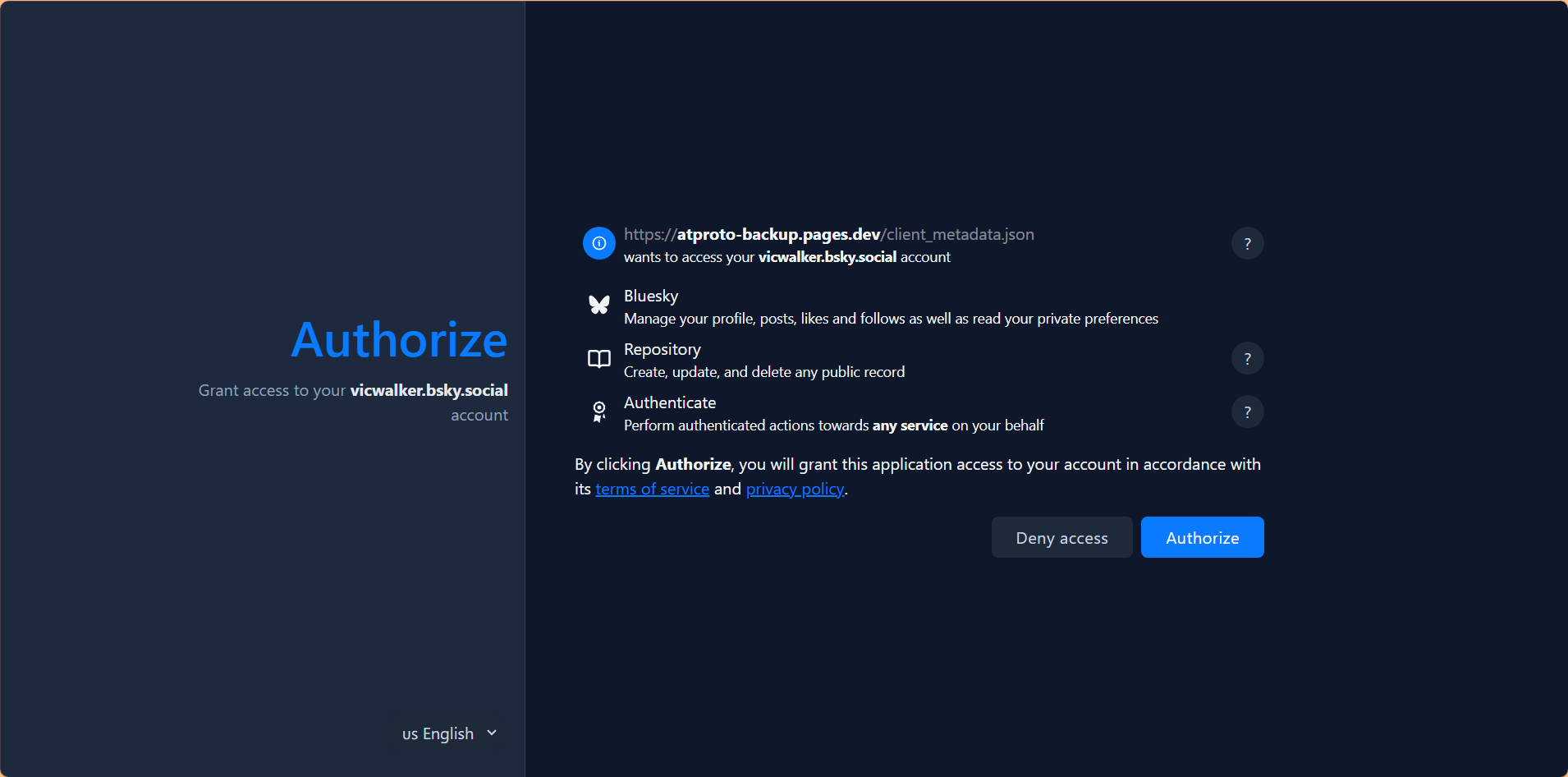 Seu navegador irá abrir na tela de login e autorização do Bluesky, preencha sua senha se preciso e clique em "Authorize".