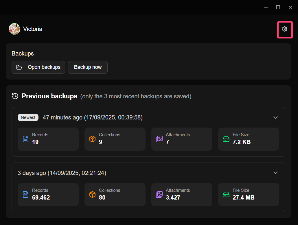 No botão de "Open backups" irá abrir o local onde os backups são salvos (apenas os 3 backups mais recentes são mantidos).