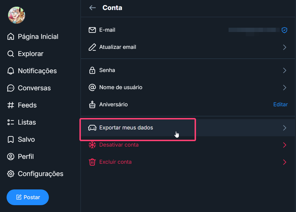 Clique na opção "Exportar meus dados".