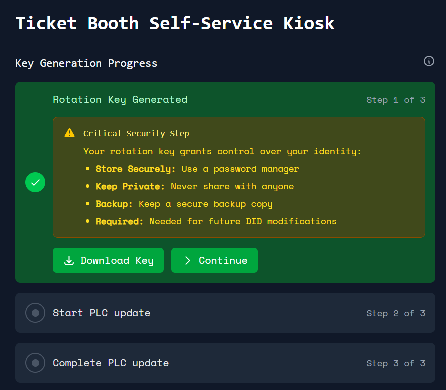 Clicando no botão "Download Key File", um arquivo de texto será salvo no seu computador com a Public Key (chave pública, do tipo did:key) junto da Private Key. Salve esse arquivo preferencialmente em um cofre digital.