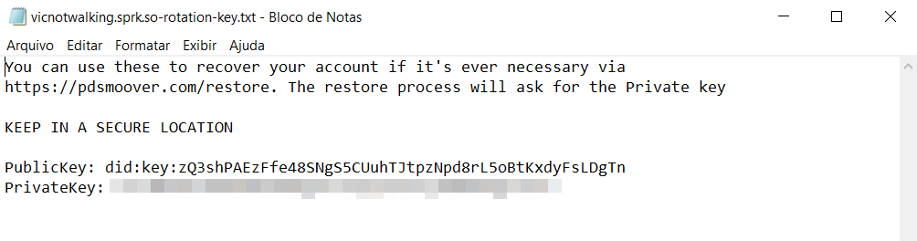 Também chamada de Rotation Key (Chave de Rotação), ela é essencial para recuperar acesso ao seu repositório, e poder migrar para outro PDS mesmo sem ter acesso ao PDS anterior (importantíssimo em situações que o PDS em que sua conta está ficou indisponível ou teve algum problema sério).