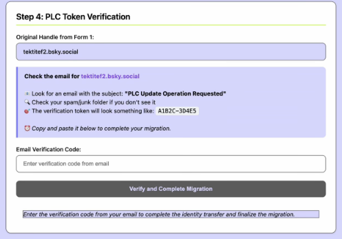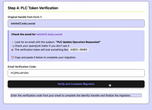 Copie e cole o token no terceiro passo, e clique em "Verify and Complete Migration".
