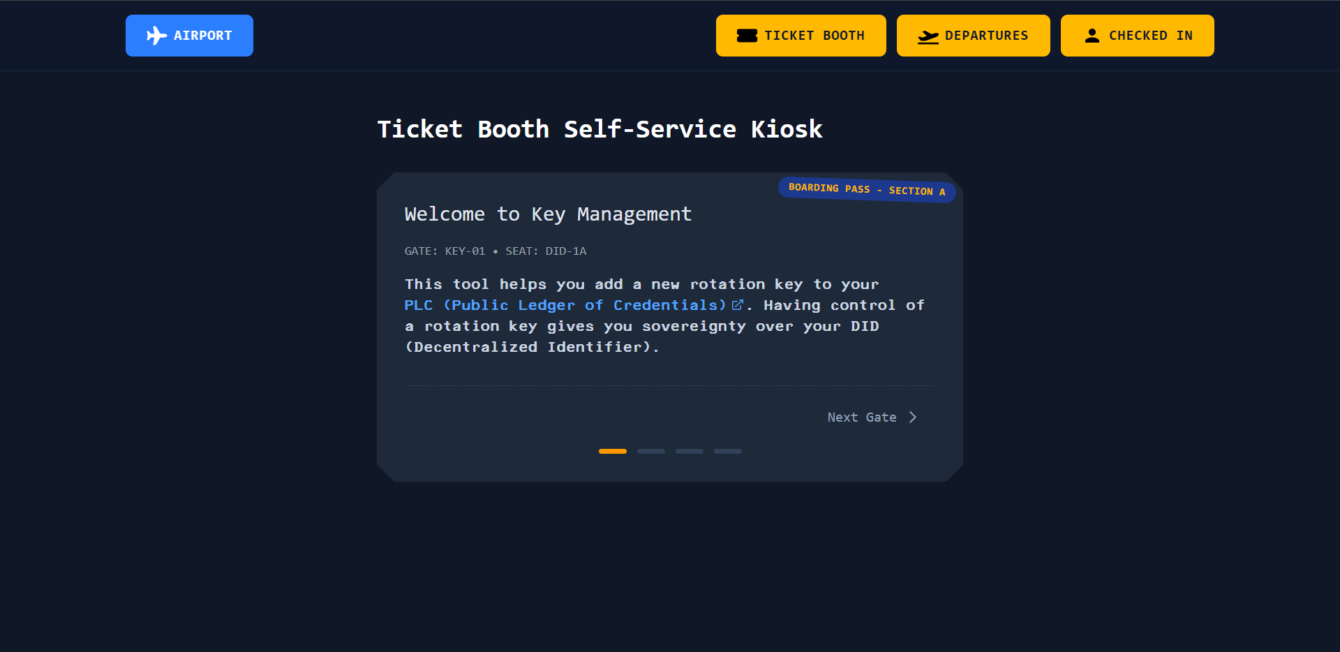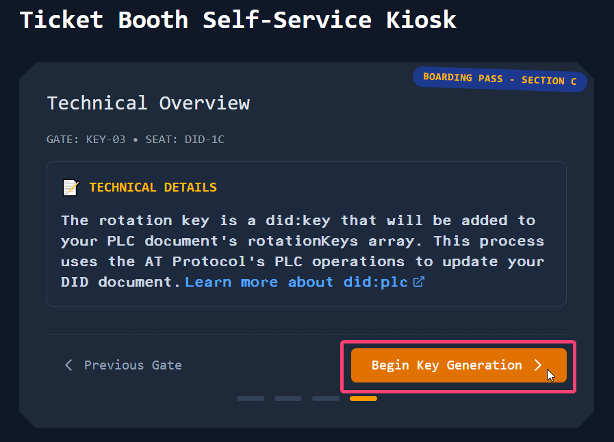 Vá para a aba "Identity". O código público da chave deverá aparecer listado em "Rotation Keys", e deverá ser o mesmo valor da Public Key (chave pública, o código após "did:key:") do seu arquivo de chave salvo (você consegue abrir o arquivo .json no bloco de notas para ver esses dados).
