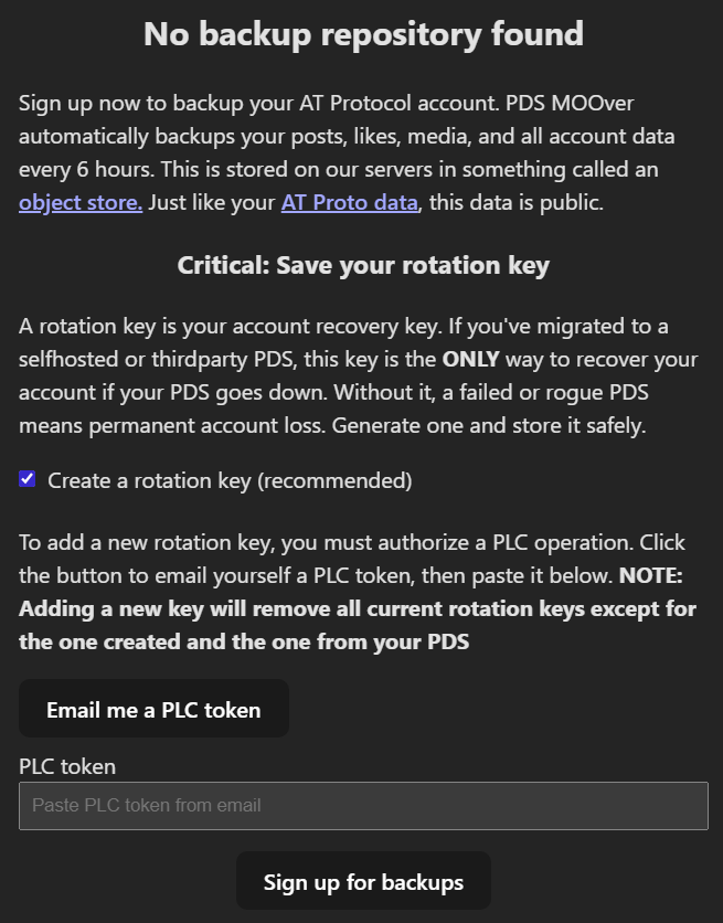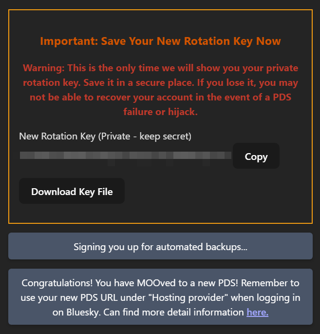 Observação: Migrar para PDSes do Bluesky PBC é somente possível para contas que foram inicialmente criadas em algum dos PDSes deles, contas que nasceram em outros PDSes não tem essa possibilidade. Tenha isso em mente antes de prosseguir, escolha um provedor confiável, confirme quaisquer regras exigidas do provedor antes de migrar, mantenha seu backup do repositório sempre atualizado após a migração e não perca sua chave de recuperação. Abaixo um tutorial para caso precise migrar de volta para o PDS do Bluesky PBC (as instruções são diferentes).