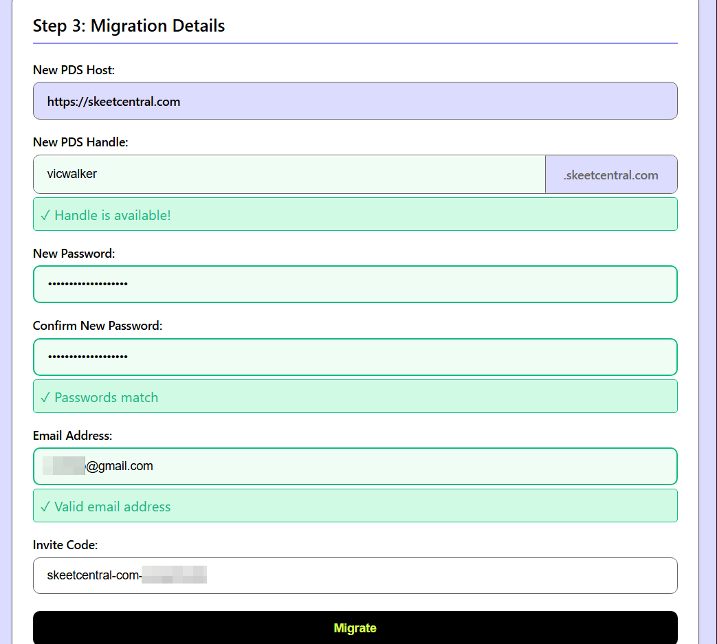 New PDS Handle: o novo username que usa conta irá ter. Preencher apenas a primeira parte do username, o final será indicado de acordo com o PDS.