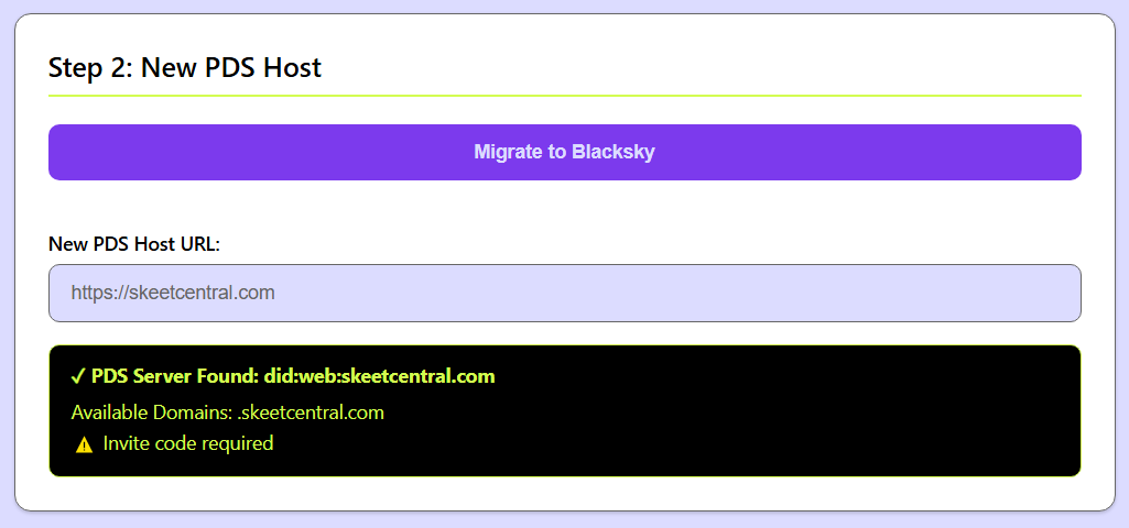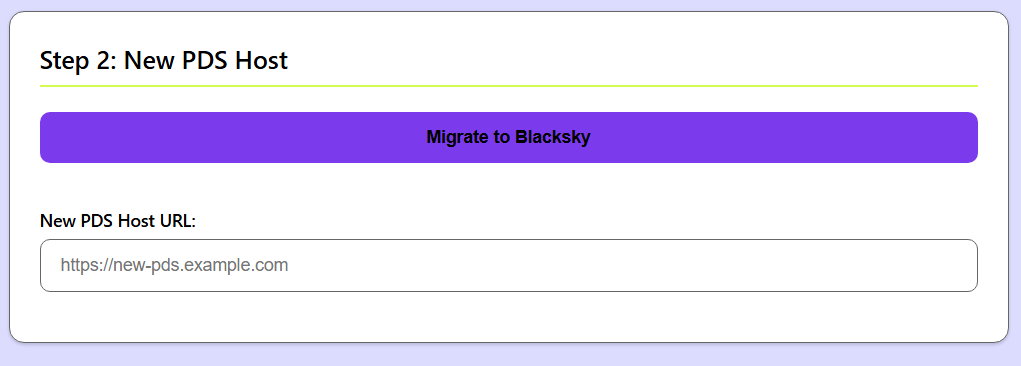 No segundo passo, caso tenha escolhido migrar para o PDS do Blacksky você pode clicar no botão "Migrate to Blacksky", caso tenha escolhido outro PDS, preencha a URL do PDS selecionado no campo de texto.